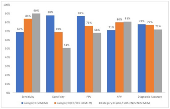 Since the AUS/FLUS and FN/SFN are the most accepted grey-zone categories of TBSRTC, sensitivity, specificity, PPV, NPV and diagnostic accuracy values were evaluated in categorical fashion (categories “I”, “II” and “III”) to be able to evaluate the idea of compressing the grey zone categories in one category, and to clarify the general diagnostic performance of TBSRTC (Figure 1).