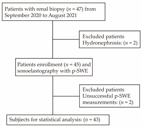 Between September 2020 and August 2021, 47 patients with clinical renal dysfunction who planned or decided to undergo ultrasound-guided renal biopsy were consecutively enrolled in this study. Additionally, all patients consented to p-SWE examinations. The results of conventional ultrasound, Doppler ultrasound, p-SWE, serum biomarkers, and biopsy for each patient were collected. The time intervals between renal biopsy and p-SWE were less than 7 days. Patients with CAD were defined as having worsened renal function for more than 3 months without recovery (eGFR < 50 mL/min/1.73 m2, increased serum creatinine). The inclusion criteria were as follows: (1) patients defined as chronic renal allograft dysfunction who planned or decided to undergo renal biopsy; (2) over 18 years of age; (3) more than 1 year since renal transplantation. The exclusion criteria were as follows: (1) companion with other diseases, including hydronephrosis and renal artery stenosis; (2) unsuccessful p-SWE measurements. Thus, 43 patients were finally enrolled for statistical analysis (Figure 1). All the patients provided informed consent to participate, and The Third Medical Center of Chinese PLA General Hospital review board approved this prospective study. No data were included that were sourced from executed prisoner’s donations, and the procedure in this study was designed in accordance with the Declaration of Helsinki. The demographic and clinical data of the patients (age, sex, body mass index, and underlying diseases) were recorded.