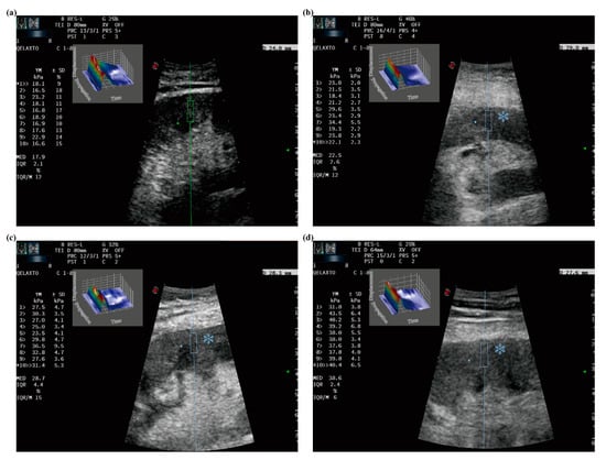 Measurements of p-SWE in renal transplants with different IF/TA stages: (a) IF/TA Grade 0, median = 17.9 kPa; (b) IF/TA Grade 1, median = 22.5 kPa; (c) IF/TA Grade 2, median = 28.7 kPa and (d) IF/TA Grade 3, median = 38.6 kPa. The line is used to drive operator to select suitable measurement areas. The square showed 3D eWave which is an exclusive tool that provides immediate feedback about the quality of the shear wave produced in the tissue, and is the three-dimensional representation of the shear waves generated by p-SWE. The asterisk showed the cooling indication (2 s in average) which is directly on the measurement site for “eye focus” feedback.