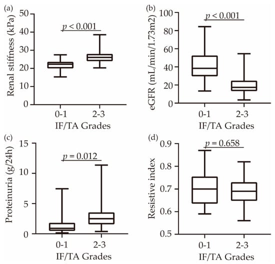 Comparison of renal function markers and p-SWE measurements between IF/TA Grade 0–1 and IF/TA Grade 2–3. The renal cortical stiffness (a), eGFR (b), proteinuria (c), and resistive index (d) were compared. The error bars are the minimum and maximum values. The lines through the middle of the boxes represent the median. The central box represents the interquartile range.