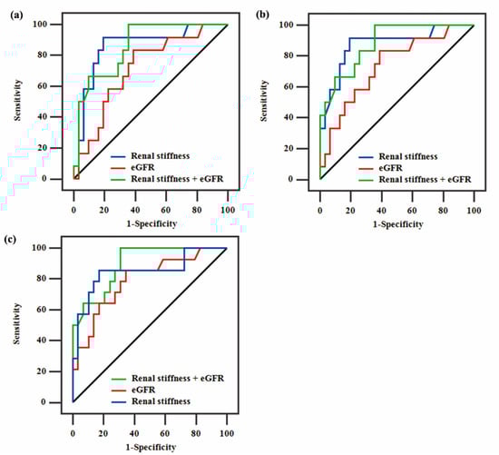 Graph showing receiver operating characteristic curves of p-SWE, eGFR, and p-SWE plus eGFR in the diagnosis of: (a) moderate-to-severe ci, (b) moderate-to-severe ct, and (c) moderate-to-severe IF/TA.