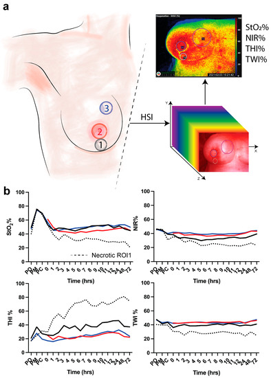 (a) Regions of interest. ROI-1 (black) is the region of the vertical scar underneath the skin island of the DIEP flap to the inframammary fold; ROI-2 (red) is the skin island of the DIEP flap. ROI-3 (blue) is the medial side of the mastectomy skin flap. Hyperspectral imaging (HSI) is performed to extract the hypercube with which the algorithm extracts 4 parameters (StO2%, NIR%, THI%, and TWI%). (b) HSI acquisition is made pre-operatively (PO), post-mastectomy (PM), post-clip (PC), and every hour for 12 h and every day for 3 days. Data are expressed as mean value.