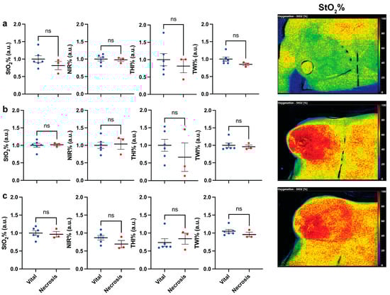 Analysis of perfusion (HSI) parameters between the vital and necrotic mastectomy skin flaps (a) pre-operatively (PO), (b) post-mastectomy (PM), and (c) post-clip (PC). On the left, cumulative statistics of all patients; on the right side, hyperspectral images of a patient at the corresponding timepoint. Data are expressed as mean ± SEM. Student t-test was used; p > 0.05 was considered non-significant (ns).