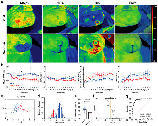 Student t-test, Mann–Whitney U test and One-Way analysis of variance (ANOVA) were used following the analysis of data distribution. Principal Component Analysis (PCA) was performed with the following continuous variables StO2%, THI%, TWI%, and time (in hours). Data were labeled depending on the diagnosis with categorical classification (“vital” and “necrosis”). The principal component analysis (PCA) was based on the standardization of data and on the largest eigenvalues. The cut-off value for StO2% was calculated using a simple logistic regression classifying data into necrosis (0) or vital (1).