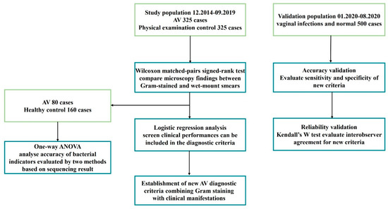 For study population, microscopic findings were compared between wet-mount and Gram-stained smears. Among them, vaginal bacteria 16S ribosomal RNA gene sequencing was conducted in 80 AV patients and 160 controls. The sequencing results were used as a benchmark to evaluate the accuracy of the two methods for assessing LBG and background flora. Finally, the AV-associated clinical features that can be included in the diagnostic criteria were screened, and new criteria that combined Gram-stained smears with clinical features were established.