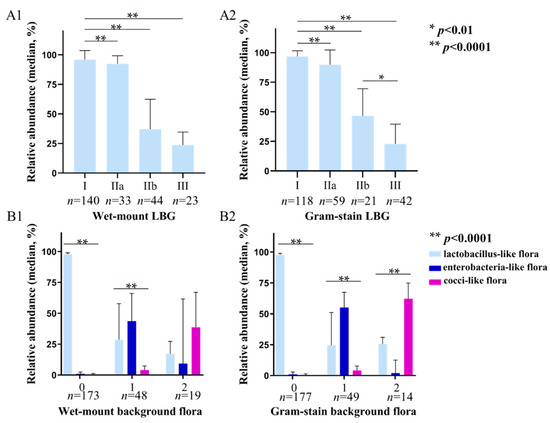 16S rRNA sequencing results according to LBG and background flora group evaluated by wet-mount (400×, phase-contrast microscope) and Gram-stained smears (1000×, oil lens). (A1,A2) show the average relative abundance of lactobacilli in each group of LBG I, IIa, IIb, and III by wet mount and Gram stain microscopy, respectively; (B1,B2) show the average relative abundance of lactobacilli, enterobacteria-like bacteria, and cocci-like bacteria in background flora group 0, 1, and 2 by wet-mount and Gram stain microscopy. *: p < 0.01, **: p < 0.0001.