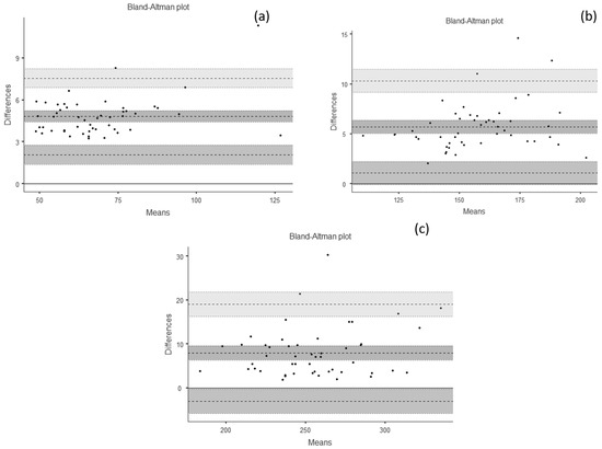 Validity analysis—Bland–Altman Plots. (a) ~70 N: bias = 4.81 (95% confidence interval [CI] = 4.41 to 5.21); lower limit of agreement (LLA) = 2.06 (95% CI = 1.37 to 2.74); upper limit of agreement (ULA) = 7.56 (95% CI = 6.88 to 8.25). (b) ~160 N: Bias = 5.70 (95% CI = 5.03 to 6.38); LLA = 1.07 (95% CI = −0.08 to 2.22); ULA = 10.34 (95% CI = 9.18 to 11.50). (c) ~250 N: bias = 7.99 (95% CI: 6.38 to 9.58); LLA = −3.06 (95% CI: −5.81 to −0.30); ULA = 19.03 (95% CI: 16.27 to 21.78).