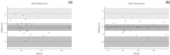 Test–retest reliability analysis—Bland–Altman Plots. (a) Flexion: bias = −2.21 (95% confidence interval [CI] = −3.87 to −0.55); lower limit of agreement (LLA) = −10.08 (95% CI = −12.95 to −7.21); upper limit of agreement (ULA) = 5.65 (95% CI = 2.78 to 8.52). (b) Extension: bias = −0.60 (95% CI = −2.56 to 1.36); LLA = −9.91 (95% CI = −13.31 to −6.52); ULA = 8.70 (95% CI = 5.31 to 12.10).