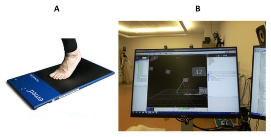 (A) Gait trial during pedobarography (photo from Novel’s web page www.novel.de, accessed on 28 November 2021). (B) Instrumented gait analysis.