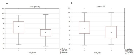 The influence of the type of the foot defined by the Arch Index on the spatio-temporal parameters: (A) speed, “-”—normal foot (median = 84.0%), “+” flat foot (median = 72.0%), and (B) cadence, “-” normal foot (median = 83.0%), “+” flat foot (median = 78.0%).