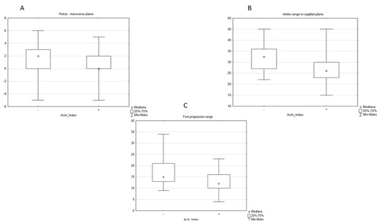 The influence of the type of the foot defined by the Arch Index on the kinematics: (A) pelvic rotation in transverse plane, “-” normal foot (median = 2.0), “+” flat foot (median = 0.0). (B) Ankle range in sagittal plane, “-” normal foot (range = 32.5), “+” flat foot (median = 26.0), and (C) the foot progression range, “-” normal foot (median = 15.0), “+” flat foot (median = 12.0).