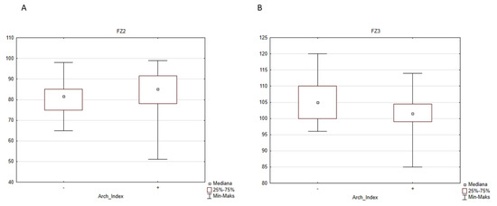 The influence of the type of the foot defined by the Arch Index on the parameters of the vertical ground reaction force: (A) FZ2 (middle of stance phase), “-” normal foot (median = 81.5% BW), “+” flat foot (median = 85.0% BW), and (B) FZ3 (push-off), “-” normal foot (median = 105.0% BW), “+” flat foot (median = 101.5% BW). BW, body weight.