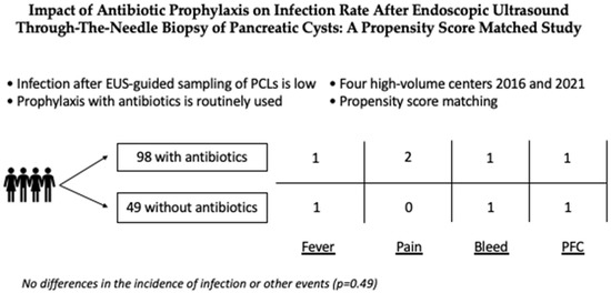 Out of 236 patients with pancreatic cystic lesions sampled with EUS-TTNB, 187 underwent EUS-TTNB with antibiotic prophylaxis and 49 without prophylaxis. After propensity score matching, two groups were compared: 98 subjects who underwent EUS-TTNB under antibiotic prophylaxis and 49 sampled without prophylaxis. A pictorial description of the study design is reported in Figure 1.