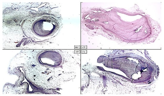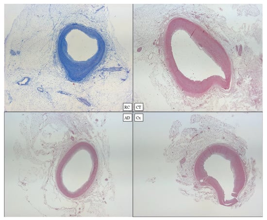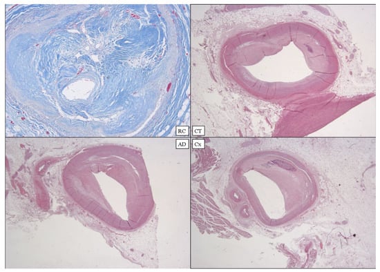 - left ventricle: in multiple fields, the myocardial architecture is altered by the presence of extensive areas of fibrotic substitution of the myocardial tissue and by interstitial and perivasal fibrosis that interrupt myocardial continuity, a characteristic mostly represented at the second section and the lateral and posterior walls, above all if compared to the anterior wall at the same section (Figure 10A,C).