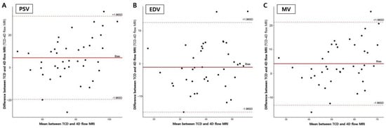 3.1. Flow Velocity Comparison between TCD and 4D Flow MRI