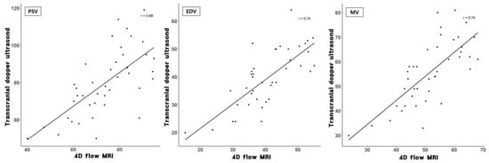 | TCD (cm/s) | 4D Flow MRI (cm/s) | Correlation | |||
