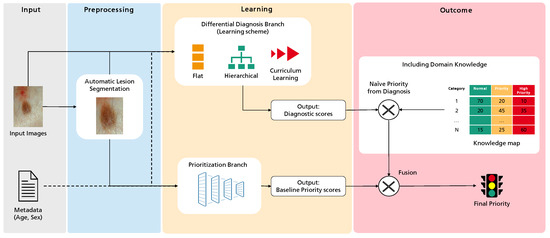 Recalling the main objective of this project—improving case referral from general practitioners to dermatology specialists—the primary goal of this work is to create a predictive model to classify the priority of a case into one of three levels: normal, priority, or high priority. Figure 1 illustrates the overall workflow of this process, highlighting four major sequential blocks: Input, Preprocessing, Learning, and Outcome. The first concerns the input data, the case properties explored for the intended task. This work considers a dermatological image and associated metadata such as the patient’s age and sex. Then, these data are subject to several preprocessing operations. These can be standard to Deep Learning, such as normalization, or specific to this work, as the optional automatic lesion segmentation and data augmentation. Then, the Learning block comprises the two branches where actual learning takes place: the differential diagnosis branch, where different learning schemes are explored, and the output are an array of scores for the set of categories under analysis, and the priority branch, which can be seen as the baseline for the target task, connecting the inputs to the priority scores output. Finally, we propose an additional Outcome block, where the different branches can be combined with domain knowledge to achieve the final priority level prediction. In this case, domain knowledge is based on a statistical distribution mapping each differential diagnosis to priority priors. Details on this map are provided below.