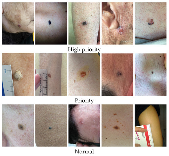 The authors had access to anonymized retrospective data from the Portuguese National Health System related to the referral requests from Local Health Care Units for the first Dermatology Hospital consultation. The referral requests that occurred between 2014 to 2020 (before COVID-19 pandemic) and only cases corresponding to single lesions with differential diagnosis available were considered. The authors counted with the support of a group of dermatologists to select the clinically relevant list of differential diagnoses to be considered when building a prioritization model for dermatological referrals. The DermAI dataset used here was first presented in [13] and consisted of a total of 3427 cases corresponding to single lesions from 13 distinct differential diagnoses. The average age (and standard deviation) of the individuals correspond to , and regarding the sex, there are 1406 male and 2021 female cases. The dataset contains mostly macroscopic (close-up) images of lesions; however, in some cases, the images are anatomical (296). The distribution of cases in relation to the differential diagnosis and priority level provided by dermatologists is presented in Table 1, and some illustrative examples of lesions with different priority levels are shown in Figure 2. The differential diagnosis refers to the diagnosis provided by dermatologists after the specialist consultation and priority refers to the level of priority in the triage process to book the consultation. It is important to stress that, although there are national guidelines to define the priority (normal, priority, and high priority), the different hospitals have a different number of specialists in this field and different resources so these data include this intrinsic variability.