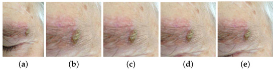 The location of the lesion was inferred from the mask. A square image patch containing the whole skin lesion was defined by finding the difference between the largest and smallest dimensions of the bounding box and by adding half of this value to both sides of the latter, except in cases where this was not possible due to the total dimensions of the image. Furthermore, a tolerance based on a percentage of the approximate radius of the lesion was studied, as neighboring pixels may include contextually relevant information. Each square area of interest was used to crop the original images for both training and testing of the differential diagnosis models explained in Section 3.3.1. The lesion patches experimented on are presented in Figure 3: original image; cropped image with no tolerance; and cropped with the inclusion of neighboring pixels corresponding to 10%, 30%, and 50% of the lesion radius.
