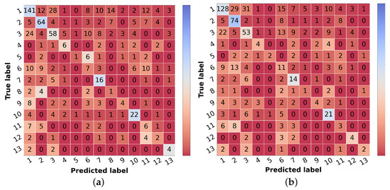 Analyzing the results concerning the hierarchical classification (B-CNN), it is demonstrated that the results of the flat classification approach, which was used as the baseline, were outperformed with both hierarchies (two and three levels). In the case of the three-level hierarchy, an absolute difference of almost 3% is verified in terms of accuracy, 2% in weighted F1, and with respect to macro F1, the improvement corresponded to around 2.5%. Moreover, comparing the two hierarchies, although the three-level hierarchy achieved slightly higher results in terms of accuracy and weighted F1, this difference was about 1.5% at most, demonstrating a similar performance between them.