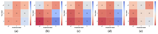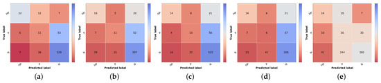 Confusion matrices of test set 1 for the different risk prioritization approaches tested. (a) Naive GT. (b) Naive (Max). (c) Naive (Sum). (d) Simple Approach. (e) Combined Approach.