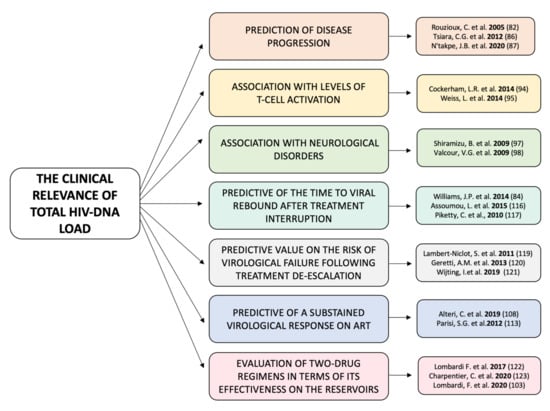 Results of several relevant studies support the predictive value of the measure of total HIV DNA level during the natural history of HIV infection. In fact, total HIV DNA load has been shown to be predictive of disease progression independently of HIV RNA load and the CD4+ T cell count in untreated HIV-positive subjects [82,83,84,85,86,87].