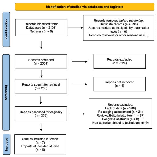 To be eligible for the final analysis, studies had to (i) include patients over 18 years of age undergoing rectal cancer surgery with curative intent; (ii) compare patients undergoing both ERUS and pelvic MRI for RC clinical staging; (iii) consider histopathological examination as reference standard. Studies were excluded if they were (i) review articles, case reports, laboratory studies or letters; (ii) unpublished data from meeting abstracts; (iii) lacking essential information for the calculation of outcomes. Two reviewers (G.L. and G.P.) independently assessed the retrieved references at title and abstract level to identify potential eligible studies. Any conflict was resolved by a third reviewer (F.P.T.) until a consensus was reached. The full text of these studies was then retrieved for further analysis.