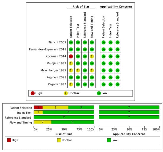 In adherence to Cochrane Collaboration recommendation, quality and risk of bias assessment was performed with the QUADAS-2 tool. This consists of four key domains: patient selection, index test, reference standard, flow and timing. Each domain is assessed in terms of risk of bias and the first three in terms of concerns regarding applicability. Signaling questions are included to assist in judgements about risk of bias [].