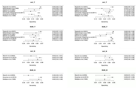Forest plots of included studies showing overall T and N parameters’ sensitivities and specificities in rectal cancer staging.
