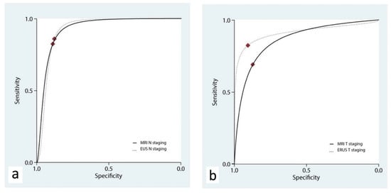 The accuracy of ERUS and MRI for N staging was assessed in three studies [,,]. ERUS had a pooled sensitivity of 0.83 (95% C.I. 0.45–0.96) and a pooled specificity of 0.88 (95% C.I. 0.73–0.95), while MRI had a pooled sensitivity of 0.82 (95% C.I. 0.64–0.92) and a pooled specificity of 0.89 (95% C.I. 0.79–0.95). ERUS and MRI showed a similar accuracy in the N staging, with AUChSROC curves of 0.92 (95% C.I., 0.89 to 0.94) and 0.93 (95% C.I., 0.90 to 0.95), respectively (p = 0.389, Figure 4b).