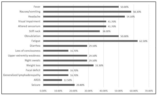 Signs and symptoms at the time of presentation, as described in Figure 1 and Table 4 included fever in 12 patients (50.0%); 14 (58.3%) complained of nausea and vomiting, 13 (54.1%) had a headache; visual impairment was noticed in 10 (41.7%), 10 (41.7%) had an altered sensorium, and 9 patients (38.0%) described stiff neck complaints. Fatigue was the most common finding, affecting 15 patients (62.5%). Seven patients (29.1%) presented with diarrhea and night sweats, while eight (33.3%) suffered weight loss. Focal deficit and generalized lymphadenopathy were found in four patients (16.7%), and five patients (20.8%) had seizures at disease onset. The least common finding was ARDS, which affected three patients (12.5%), who required ICU admission.