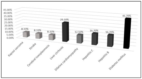 In Figure 2, underlying diseases found on admission are presented. Ten patients (41.7%) had diabetes mellitus. Liver cirrhosis was found in seven patients (29.1%). An equal number (four) of patients (16.7%) had chronic hepatitis B and C. A small number of patients (8.3%) were diagnosed with Kaposi sarcoma, stroke, or cerebral toxoplasmosis. Three patients (12.5%) had dilative cardiomyopathy. Diabetes mellitus and liver cirrhosis were the most frequent comorbidities in our study group.
