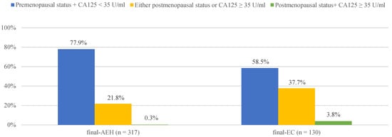 The distribution of final-AEH and final-EC patients diagnosed postoperatively in 3 subgroups according to menopausal status and CA125 value preoperatively. Notes: According to menopause status and serum of CA125 level, patients were divided into three subgroups: “premenopausal status + CA125 <3 5 U/mL”, “either postmenopausal status or CA125 ≥ 35 U/mL” and “postmenopausal status + CA125 ≥ 35 U/mL”. Abbreviations: final-AEH, atypical endometrial hyperplasia diagnosed by final histopathology; final-EC, endometrial cancer diagnosed by final histopathology; CA125, cancer antigen 125.