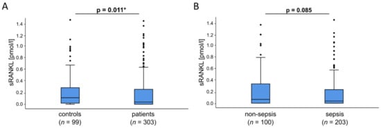 Among critically ill patients sepsis and septic shock still represent the most common cause of death, due to multiple organ failures as a result of dysregulated immune responses to an infection [1]. Despite great advances in therapy for critically ill patients early diagnosis and risk evaluation remain difficult but tremendously crucial for stratification according to prognosis and adequate management [2,3]. Therefore, biomarkers may ease and objectify early diagnosis besides clinical evaluation and common assessment scores [4]. Receptor activator of nuclear factor κ B (RANK) is a member of the tumor necrosis factor receptor family. Signaling of RANK is induced by RANK-ligand (RANKL) or its soluble form (sRANKL). Most comprehensive data of the RANK/RANKL system describe bone remodeling and repair via differentiation and activation of osteoclasts in combination with osteoprotegerin (OPG), a decoy receptor for RANKL [5,6]. Major intracellular downstream targets of RANK are nuclear factor κ B (NF-κB) and c-Jun N-terminal kinases (JNK), key regulators of inflammatory processes, antiviral responses and apoptosis [7]. Estrogen is a natural suppressor of RANKL explaining high rates of osteoporosis in postmenopausal females as activation of osteoclasts is suppressed ineffectively and bone turnover is stimulated [7]. Experimental work further demonstrated impaired lymph node development in RANKL deficient mice accentuating the interaction between bone metabolism and immunity as osteo-immunity [8,9]. Previous work highlighted the role of RANKL in adaptive immunity as RANKL is expressed on various immune cells, mainly T cells [10]. Moreover, recent studies elucidated the functional role of the RANKL/RANK/OPG in the central nervous system participating in thermoregulation and incorporating a protective role in ischemic stroke [11,12]. Kiechl et al. demonstrate that high sRANKL plasma concentrations are associated with type 2 diabetes mellitus (T2DM). Inline, blocking RANKL signaling in a mouse model of T2DM lowered glucose serum levels and improved insulin sensitivity [13]. Recent studies highlighted the relevance and described the potential roles of various growth factors and adipokines (e.g., Adiponectin, Leptin, Omentin and Resistin) in the course of critical illness and sepsis [14]. Adipokines are secreted from the adipose tissue and are, therefore, upregulated in obese patients displaying important regulators of body homeostasis, as well as immune responses to inflammation. sRANKL and its downstream targets are key regulators of a great spectrum of inflammatory responses, immune reactions and metabolic-related disorders, and therefore, potentially linked to critical illness. However, the relevance of sRANKL in critically ill and septic patients has not been reported to date and the functional role remains uncertain. We, therefore, investigated the clinical and diagnostic relevance of sRANKL serum concentrations as a potential biomarker in a large cohort of 303 critically ill patients.