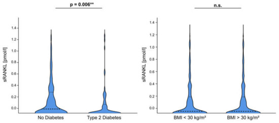 sRANKL serum levels are associated with type 2 diabetes. sRANKL serum concentrations were significantly decreased in patients diagnosed with type 2 diabetes but did not correlate with BMI classification (BMI < or > 30 kg/m2). All data are shown as available. ** p < 0.005, n.s.: not significant.