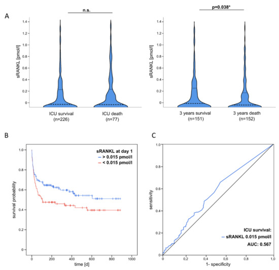 Prediction of ICU and long-term mortality by sRANKL serum levels. (A) sRANKL serum levels at ICU admission did not correlate with ICU survival but predict a poor overall survival in the long-term (three years of follow-up). (B) Kaplan–Meier survival curves of critically ill patients are displayed for the three years of follow-up demonstrating that patients with sRANKL serum levels below a cut-off value of 0.015 pmol/L had a higher probability of long-term mortality. (C) ROC curve analysis reveals that sRANKL serum concentrations at an optimal predictive cut-off value for long-term survival (0.015 pmol/L) at admission to ICU had an AUC value of 0.567 regarding discrimination between 3 years survival and 3 years death. All data are shown as available. * p < 0.05, n.s.: not significant.