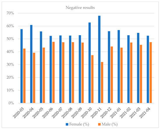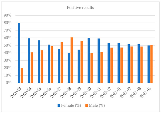 Women shared approximately 53.84% of the positive results total. Most of the tests were performed in October 2020 and the least in April 2020 (full months). Most of the positive results were recorded in October 2020 and the least in July 2020 (full months). The highest percentage of positive results regarding the share of all the results was recorded in March 2021 while the lowest was in July 2020 (full months) (Figure 1, Figure 2, Figure 3, Figure 4, Figure 5 and Figure 6).