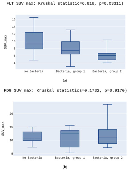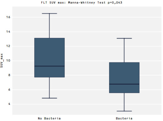 Comparing the uptake of [18F]FLT between the two groups No bacteria vs. presence of Bacteria (Bacteria group) there was a significant difference in SUVmax values (9.2 vs. 6.4, p = 0.043, respectively) (Figure 4)