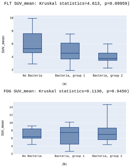 (a) presents the highest SUVmax in the No Bacteria Group, followed by Group 1, and the lowest in Group 2 for the [18F]FLT, p = 0.03. (b) presents no differences between SUVmax in the No Bacteria Group, Group 1, and Group 2 for the [18F]FDG, p > 0.05.