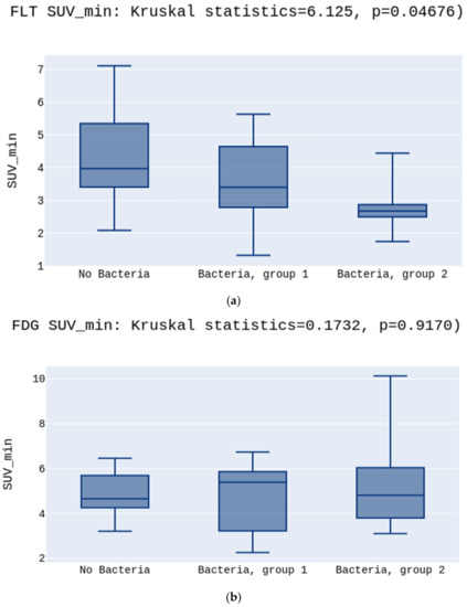 (a) presents the highest SUVmin in the No Bacteria Group, followed by Group 1, and the lowest in Group 2 for the [18F]FLT, p = 0.03. (b) presents no differences between SUVmin in the No Bacteria Group, Group 1, and Group 2 for the [18F]FDG, p > 0.05.