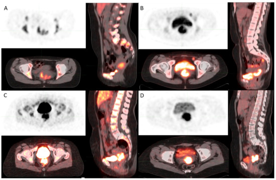 Molecular imaging tools such as positron emission tomography (PET) in combination with structural imaging computed tomography (CT) or magnetic resonance imaging (MRI) (PET/CT or PET/MRI) provide noninvasive measurements of molecular pathways and an anatomic reference. PET/CT uses 2-deoxy-2-[18F]fluoro-D-glucose, (2-[18F]FDG) to identify cells that rapidly uptake glucose, including tumor cells. PET findings in untreated CC can lead to modifications in the staging and treatment plan [5,6]. Therefore, performing [18F]FDG PET/CT imaging is recommended before radical treatment [https://www.nccn.org/professionals/physician_gls/pdf/cervical.pdf (accessed on 8 December 2021)]. It has, however, some limitations. It also reflects the physiological changes that are part of the inflammatory process and the host response to infection. Because [18F]FDG PET relies upon glucose incorporation into cells, the uptake will be present in tumor cells and normal tissues with a high glucose metabolism such as the brain or left ventricle of the heart and inflammatory lesions due to uptake by macrophages and granulation tissues. Different radionuclides are used in nuclear medicine to improve the sensitivity and specificity of primary tumor detection.