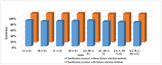 Figure 4 reports the classification accuracy of the proposed AB_BP_NN model with and without the feature selection phase. As most of the epileptic EEG data are non-ictal, a new experiment that reflected the actual situation of EEG data was designed to test the proposed model. In this experiment, the epileptic EEG signals were separated into two different sets.