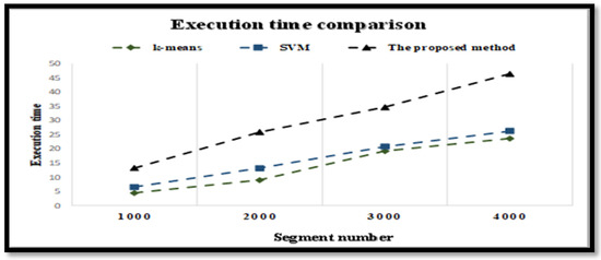 Figure 6, it can be noticed that the proposed model had a slightly higher execution time than the SVM and k-means methods. However, the increase in the execution time is reasonable compared with the increase in classification accuracy.