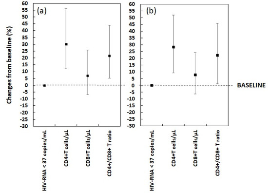 Immunovirological changes (%) from baseline: Plot report differences in immunovirological profile comparing baseline with week 48 in (a) overall patients and (b) >55 years old population. Ranked mean relative difference for each marker. Vertical bars indicate the IQR. The same axis value ranges were used in each case for ease of comparison.