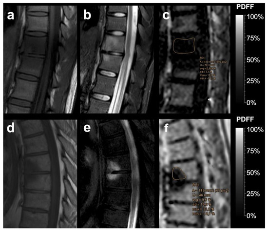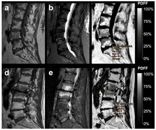 - Krug, R.; Joseph, G.B.; Han, M.; Fields, A.; Cheung, J.; Mundada, M.; Bailey, J.; Rochette, A.; Ballatori, A.; McCulloch, C.E.; et al. Associations between vertebral body fat fraction and intervertebral disc biochemical composition as assessed by quantitative MRI. J. Magn. Reson. Imaging 2019, 50, 1219–1226. [Google Scholar] [CrossRef]