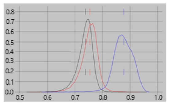 Feature contribution to classification accuracy. Histograms of the contribution of feature #1 to classification accuracy are shown for empty-room vs. rest (red), empty-room vs. task (black), and rest vs. task (blue). See text for details. Of the four features used in the classifications, #1 depends most heavily on the direction of current flow. It is expected to make a greater contribution to classifiers for one brain state vs. another than for a brain state vs. empty-room results. The figure confirms this expectation.