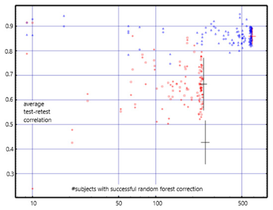 The correlations are centered about 0.85 for the short-term; they were centered about 0.8 using the previously reported empty-room correction [12]. For the long-term, they are centered about 0.67; they were centered about 0.45 with the previous correction (see Figure 3). The mean long-term differences are consistently near zero and are much less than those found with the previous empty-room correction. Test-retest reliability with values with the random forest empty-room correction is high in both the short-term and long-term and is consistently better than with the previously reported empty-room correction.