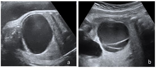 Cyst’s classification according to Nussbaum criteria: (a) Simple cyst with thin wall and anechoic aspect, (b) complex cyst with intracystic septation.