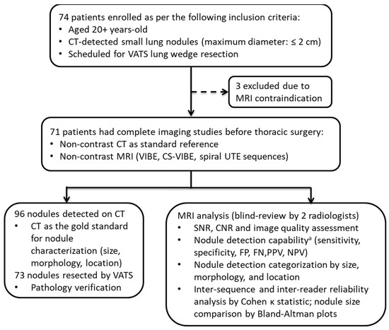 - The pulmonary nodules detected by the imaging modalities, including CT and MRI, were scheduled for VATS resection, and pathology correlation (malignant vs. non-malignant) of the nodules was performed.