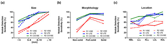 As shown in Figure 3b, the nodule detection rate was yet to be improved in the non-solid morphology group (average values for spiral UTE: 70% and CS-VIBE: 71%, by two readers), and trustworthy in nodules with part-solid (average values for spiral UTE: 91% and CS-VIBE: 94%, by two readers) and solid morphology (average values for both spiral UTE and CS-VIBE: 92%, by two readers).
